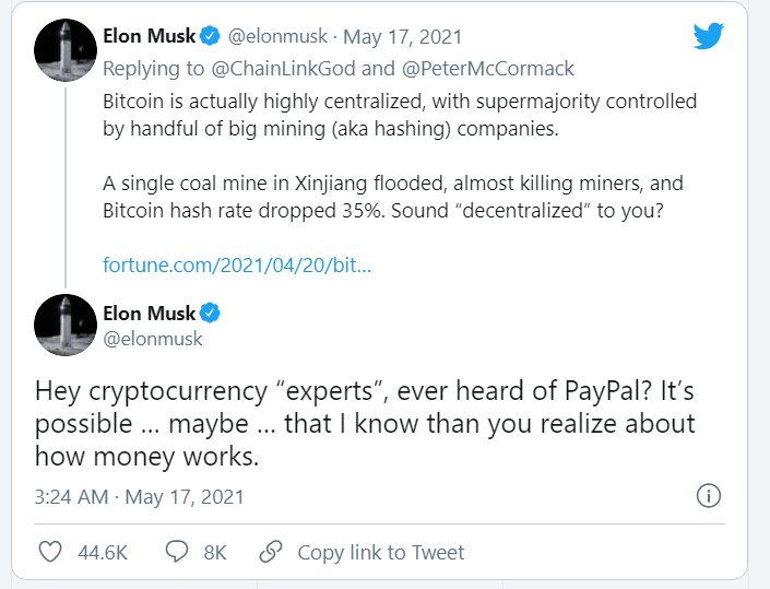머스크는 비트코인의 업무증명 합의 메커니즘이 분산된 상태를 유지하는데 도움이 된다는 주장도 샅샅이 뒤졌습니다.