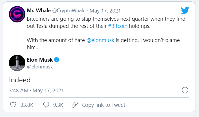 트위터 사용자 @CryptoWhale이 트윗을 하자 `비트코인 사용자들은 테슬라가 나머지 돈을 버린 것을 알게 되면 다음 분기에 자신을 때릴 것`이라는 가상 시나리오를 트위터에 올렸습니다. #비트코인 홀딩스[holdings]라고 머스크는 한 마디로 대답했습니다.