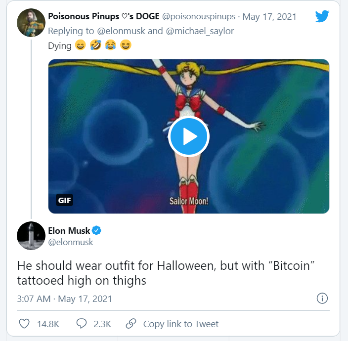 머스크는 그를 '세일러 문'이라고 부르며 '비트코인' 문신을 허벅지에 새긴 채 애니메이션 캐릭터 '세일러 문'처럼 분장하자고 제안했습니다.