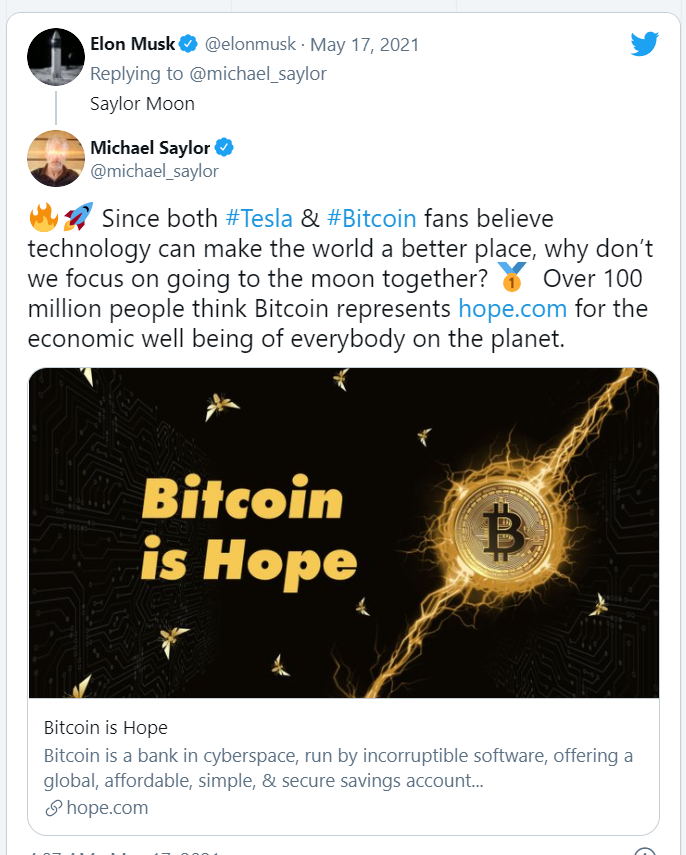 머스크는 또 자신의 회사인 미국 클라우드 컴퓨팅 기업 마이크로 스트래티지[MicroStrategy]의 재무부를 이용해 돈을 써온 비트코인 울트라불 마이클 세일러[Michael Saylor]에 대해서도 조준 훈련을 실시했습니다. 비트코인으로 수십억 $.