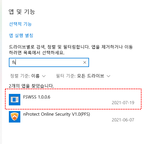 프로그램 추가제거란에 들어가서 fswss를 검색해준 뒤, 삭제해주면 끝입니다.