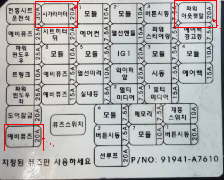 방법은 파워소켓 또는 시거잭을 컨트롤 하는 작은 퓨즈를 교체해주기만 하면 됩니다.